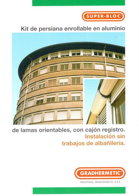 Es un conjunto formado por la persiana enrollable de lamas orientables Super Gradhermetic junto con un cajón de registro de aluminio, guías y su accionamiento correspondiente. Permite su instalación sin necesidad de albañilería.